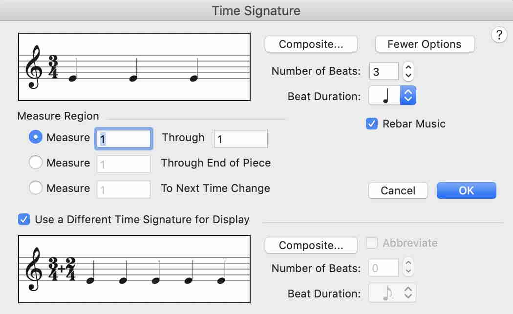 In the Time Signature Tool you can set both a “real” time signature and a “display” time signature: