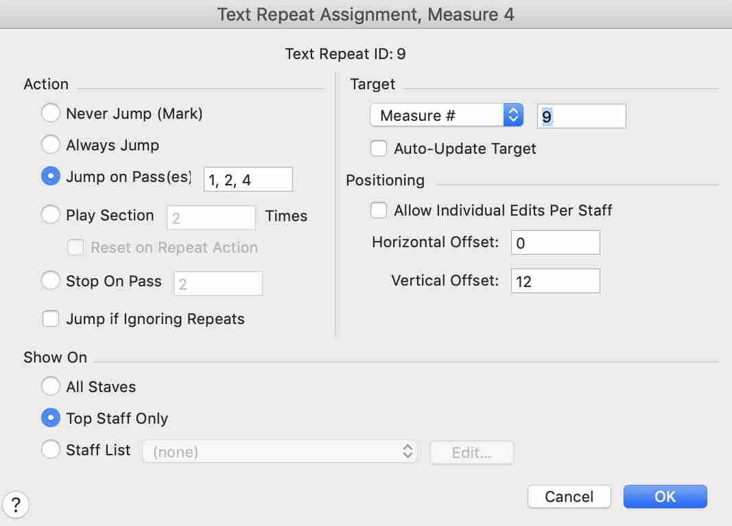 This would be indicated in standard "commercially-released" sheet music by placing the 13 measures in the same repeated section, with an ending-style "horizontal bracket" over measures 5 - 8 (in the middle of the section) and a caption such as "Play third time only". I can use SmartShapes and Text to create the visual effect, but that won't cause the effect to be generated on playback; by default, measures 5-8, which should be skipped on the 1st, 2nd, and 4th passes, would play on all 4 passes. I've seen many (although not a lot) of sheet music where some of the "pre-ending" repeat sections have measures meant to be skipped except on certain passes, and I'd like to be able to generate the appropriate playback effect without having to "arrange" the piece differently.
