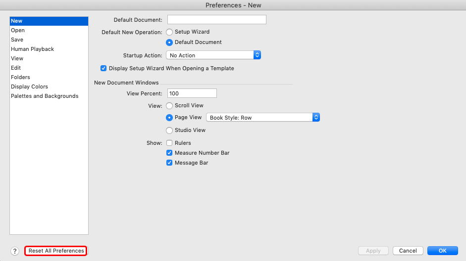 P.S. you can locate your preferences file (com.makemusic.finale.fprf), place in another location, then try resetting preferences. A new preference file will be created. If you don't like what you get, just put the previous preference file back where it was.
