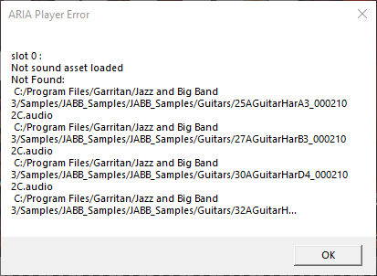 I'm at a complete loss here. I just installed the JABB library, and ARIA just cannot for the life of it find the samples. Everytime I try to load an instrument from the ARIA Player, this message appears. Additionally, there's no sound when I try to play these in Finale on my instruments.
