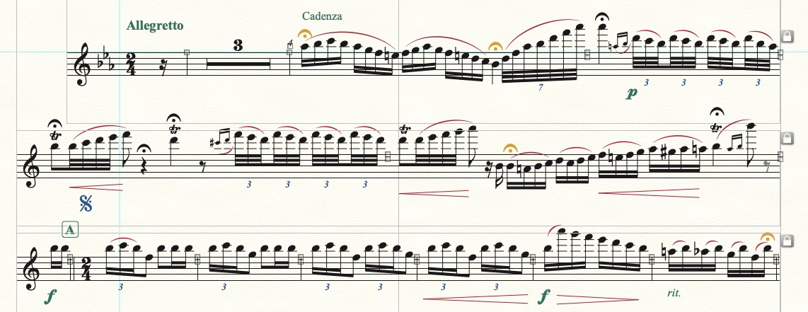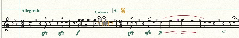 I have done a lot of searching for the issues with cadenzas in Finale and am using the technique of creating the cadenza across several measures. This seems to be the way to do it, since the horizontal split points don't seem to work well (from what I read). I did 5 measures, 6/4. 2/4, 5/4, 8/4 and 1/8 to fit the cadenza in the solo part. I am hiding the bar lines and turning off measure numbers in those measures so the cadenza looks like one measure and the numbering comes out correctly. This works fine in the score and the solo part with the written cadenza. What I am having trouble with is the formatting of these extra measures in the remaining parts. I have hidden the unnecessary rests, so the measures have the correct number of beats, however, I can't squeeze the extra measures enough for the spacing to look correct. In fact, no matter what I do or how the measure looks on the screen, once I print the part, the measure never prints the way it looked. Finale always moves things around to some degree and I can't really get what I want.