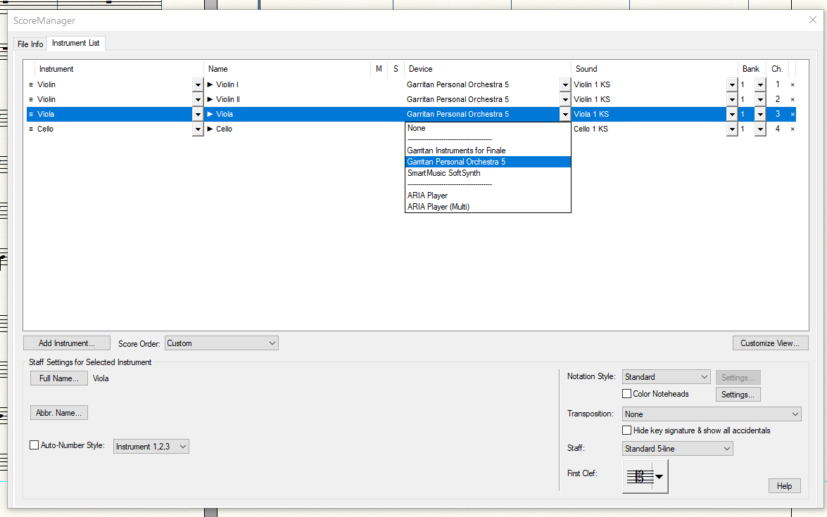 Finale default instruments, SmartMusic SoftSynth, and GPO5 show up in the Device List in Score Manager, but not GPO4.