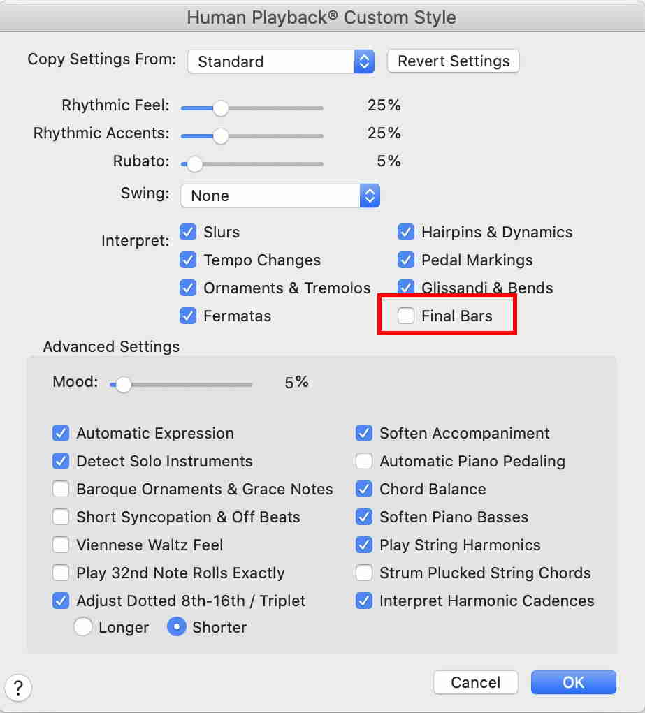 For some reason, Finale always slows down the tempo on the last bar of a song (in the case of a song ending with a repeat section, on the last repetition of the last bar). Sometimes, I don't want this behavior--say, if a song is meant to fade out or end abruptly (like many pop songs today do). How do I disable the auto-ritardando on the last bar?