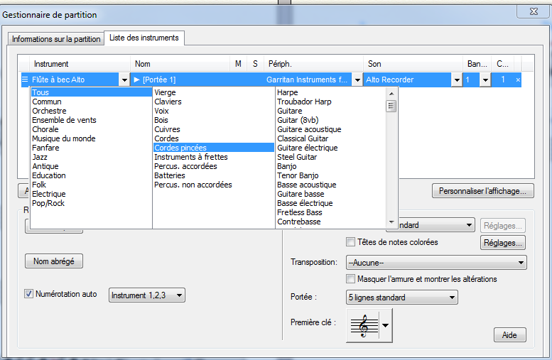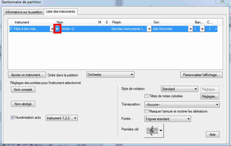 I don't find the possibility to choice it and I don't know which one is playing. In the score edition, we can see only the instrument for the melody, hier a Flûte alto.