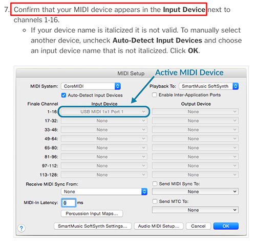 In Finale's user manual, the instructions for the MIDI Setup window says, “Confirm that your MIDI device appears in the Input Device”.