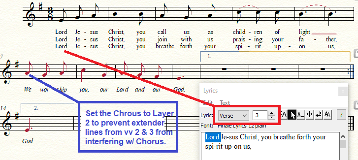 I am trying to enter a litany into Finale. There are 12 verses, each with a, b, and c parts. The a and b parts have one ending and the c parts have another that then goes back to the refrain/chorus (which has a final ending as well as the ending leading to the next verse). I'm not concerned about Finale playback. I have entered all the lyrics successfully, except I can't get the verses in. Finale will only put one verse under another, not a section under a verse. Is there a way to enter the lyrics without assigning them to verses 1-36 and manually entering the correct verse numbers?