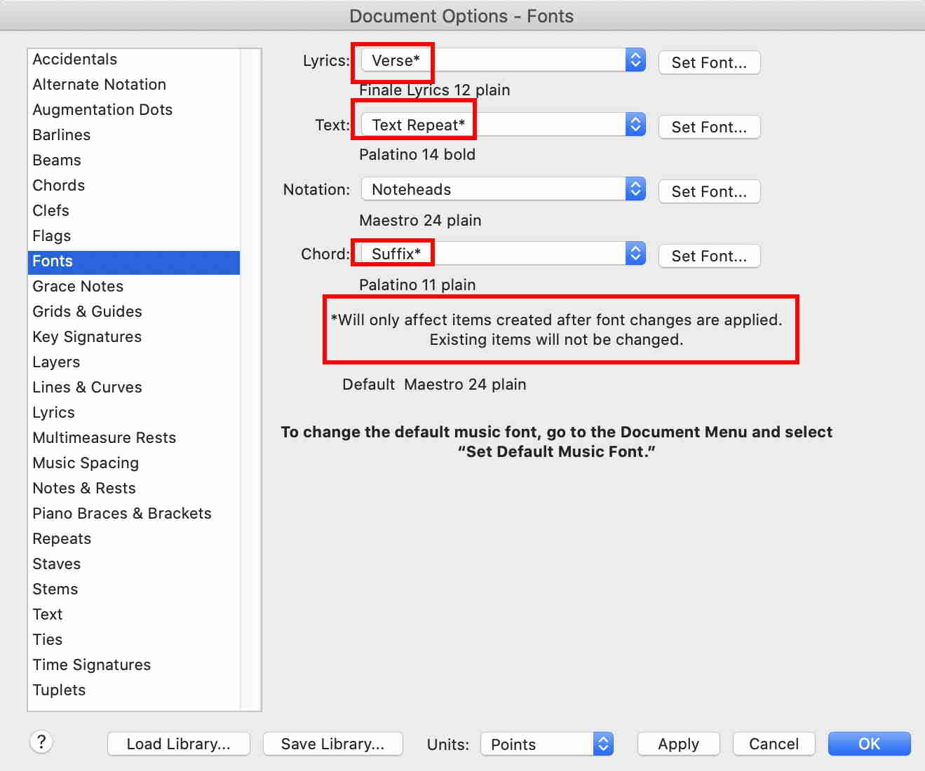 Why after changing the chord suffix font in document options nothing change in the the newer created items?