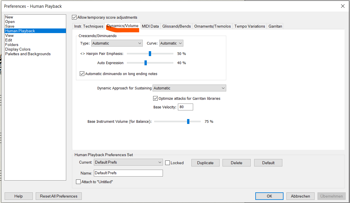 When Human Playback is active, Finale plays automatically the hairpins. You can control it here: Edit > Preferences > Human playback > Dynamics/Volume I don't know how to control the ritenuto. Jürg