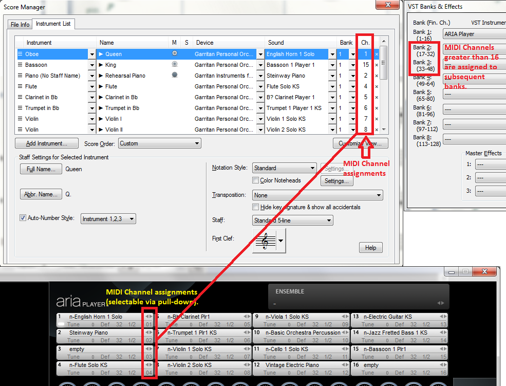 I have an orchestral score and want each staff on a separate MIDI channel. That means, I think, that I must use 2 banks, 1 for 1-16, and bank 2 for 17-32. But how do I tell what staves are assigned to what channel? I moved around some of the staffs.