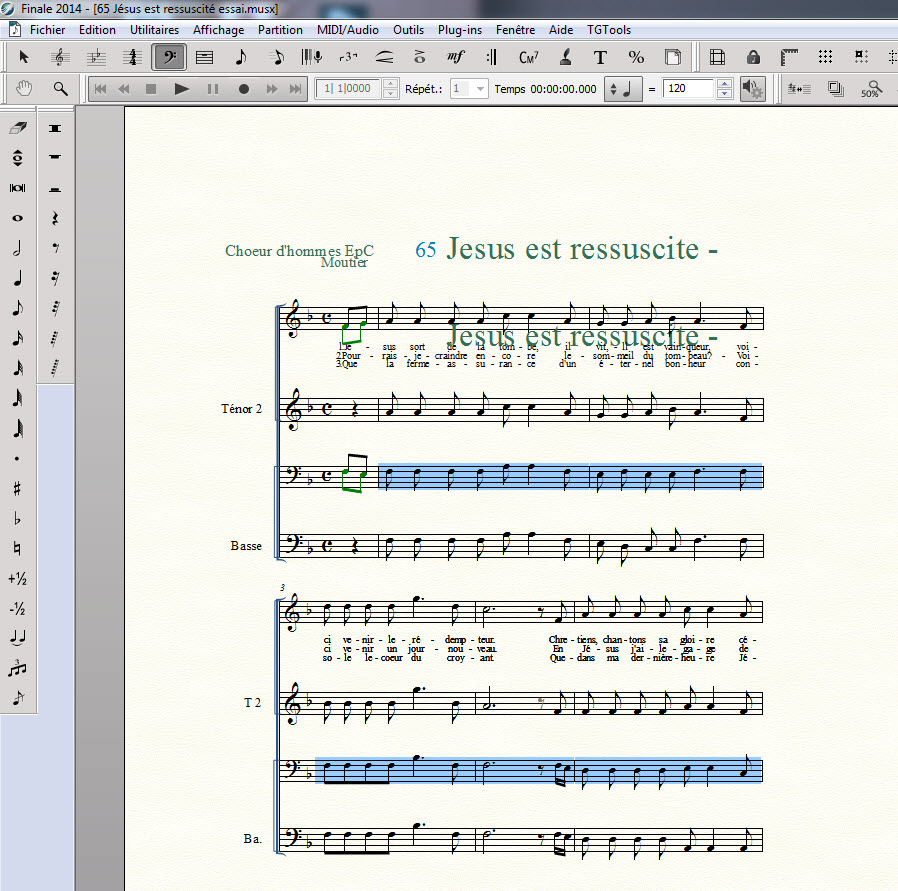 1) Pour un choeur d'hommes, il m'arrive soit de réécrire de vieilles partitions et pour les apprendre, je les écris dans un système à 4 voix, ce qui permet d'écouter chaque voix, soit je les scanne avec SmartScore X2 Songbook, les corrige et les importe dans Finale. Elles sont alors du format courant: système double avec 2 voix par portée.
