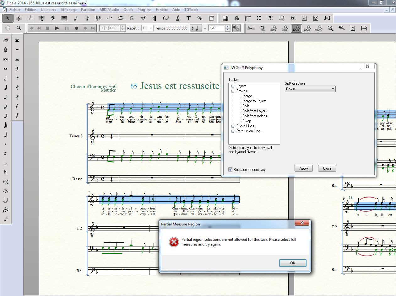J'ai toutefois un problème. Pour séparer les voix d'un système à 2 portées ayant chacune 2 voix, si je sélectionne une portée ou plusieurs dans la partition, quelque soit le plug-in de JW Staff Polyphonie que j'utilise (split, remove, split from layer...), j'ai une fenêtre erreur "Partial region selections are not allowed for this task. Please select full measures and try again"