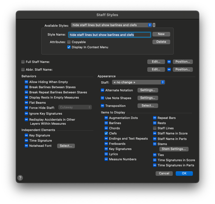I tried to create a cutaway score, but even if I redefined the existing staff style to display staff names, they disappear. Also, no way to display multiple empty measures in a row for all instruments (ie, "tacet") or multimeasure rests with the staff style for cutaway scores. Not a big deal but was curious how others do it. Thanks.